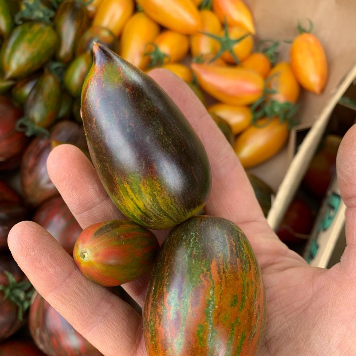 Cette Tomate originaire de Californie, appelée Brad’s Atomic Grape, présente des couleurs remarquables. En forme de prune, elle donne de petits fruits allongés multicolores et bien sucrés. Dès le début de la culture on observe que les parties des fruits exposées au soleil sont de couleur plus foncée que les parties qui restent à l’ombre. Les tomates immatures de couleur vert clair virent au soleil à un vert foncé flambé, avec des épaules bleu – noir et des rayures lilas. Au début de la maturité, la majeure partie du vert disparaît pour être remplacée par des nuances jaunes, oranges et rouges. Dans l’assiette, en salade ou à l’apéro, c’est une variété à découvrir et à faire découvrir. Il s’agit d’une sélection spectaculaire de Bradley Gates dans la Napa Valley, au nord de San Francisco. La variété a été introduite sur le marché en 2017 et a été récompensée par le prix « Best in the Show » à la National Heirloom Expo à Santa Rosa, en Californie.